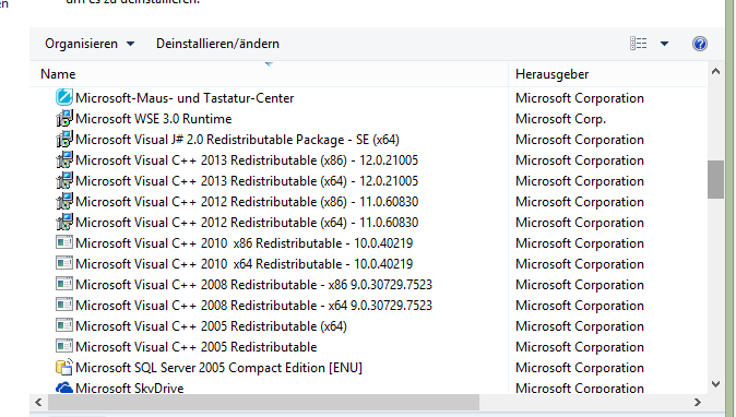 Schau mal bitte unter Systemsteuerung -> "Programme und Funktionen" nach ob du dort etwas von "Microsoft Visual C++ 2005 Redistributable ..." und "Microsoft Visual C++ 2008 Redistributable ..." findets.