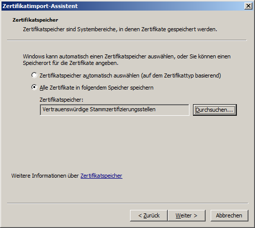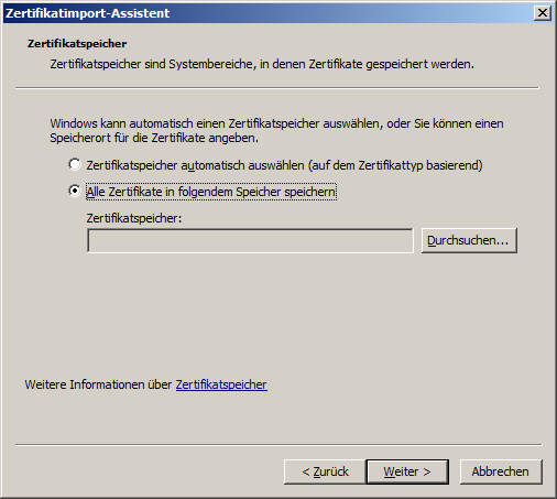 Alle Zertifikate in folgendem Speicher speichern anklicken, dann